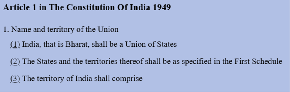 - The inclusion of both the names "India" and "Bharat" in Article 1 was a way to acknowledge the cultural and historical diversity of the nation. It was also a way to bridge linguistic and cultural differences among various regions by recognizing both the Sanskrit-derived "Bharat" and the internationally recognized "India."