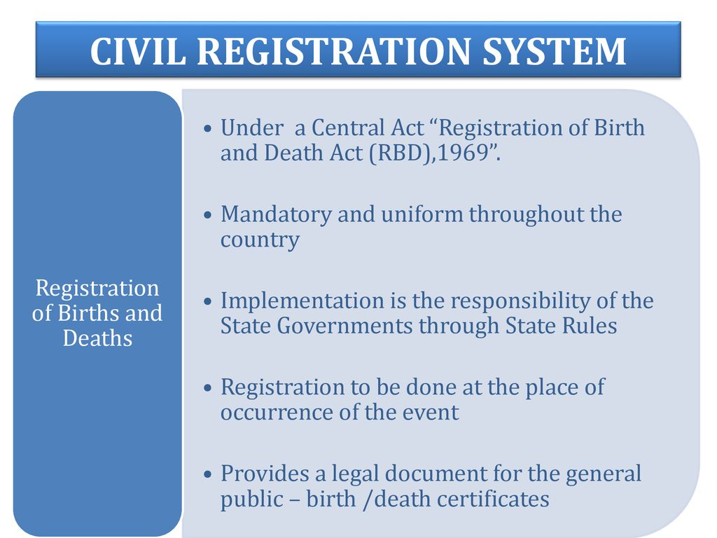 - Post-independence, the Registration of Births and Death Act (RBD Act) was enacted in 1969 to promote uniformity and comparability in the registration of Births and Deaths across the country.