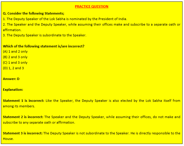 - The Deputy Speaker is not subordinate to the Speaker. He is directly responsible to the House.
