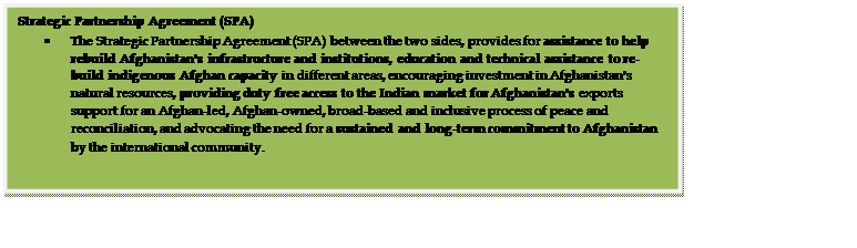 - In recent past, India-Afghanistan relations have been further strengthened by the Strategic Partnership Agreement, which was signed between the two countries in October 2011.