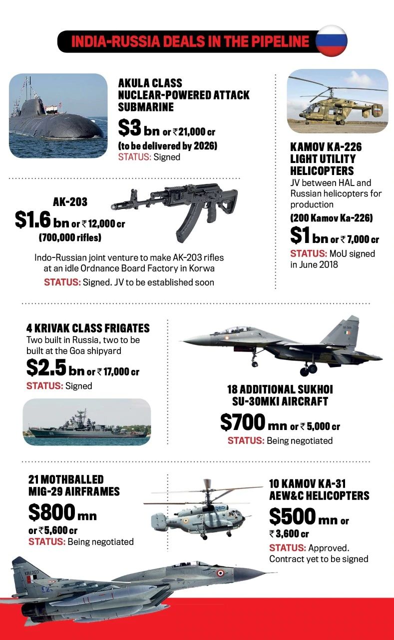 - Agreements on supply of S-400 air defence systems, construction of frigates and shareholders agreement on the formation of joint venture to manufacture Ka-226T helicopters in India.
