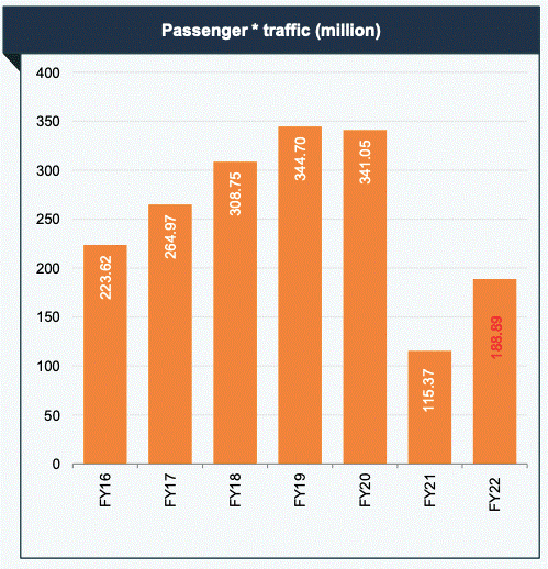 - In FY 22, India’s passenger traffic stood at nearly 189 million, out of which domestic passenger traffic accounted for over 166 million, a 58% YOY rise from 105 million in FY 21.
