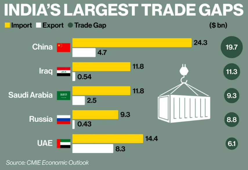 - While China has been one of the top trading partners, India's deficit has widened over the years.