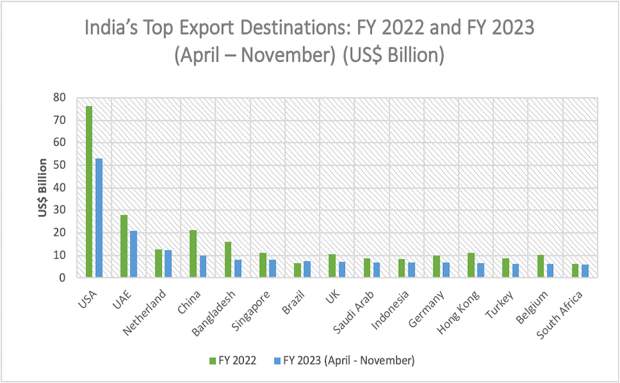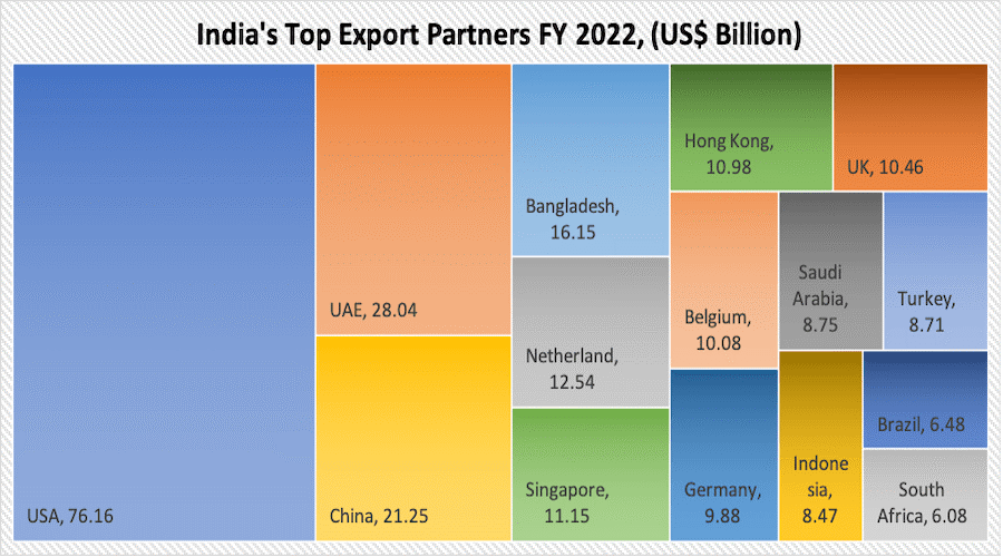 - The US, UAE, Netherlands, China, Bangladesh, Singapore, Brazil, UK, Saudi Arabia, Indonesia, Germany, Hong Kong, etc. are among India’s leading export destinations.