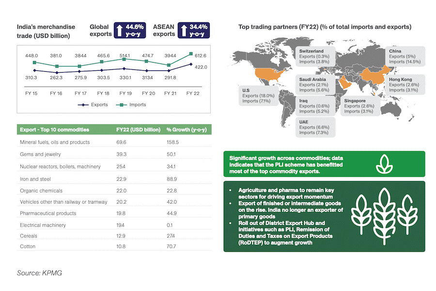 - The government estimates that India will achieve an export target of US$450 billion during FY 2023.