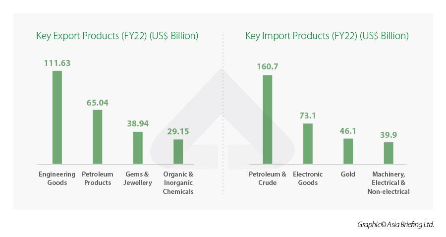 - The top exports of India are engineering goods, gems and jewelry, petroleum products, drugs and pharmaceuticals, organic chemicals, electronic goods, etc.
