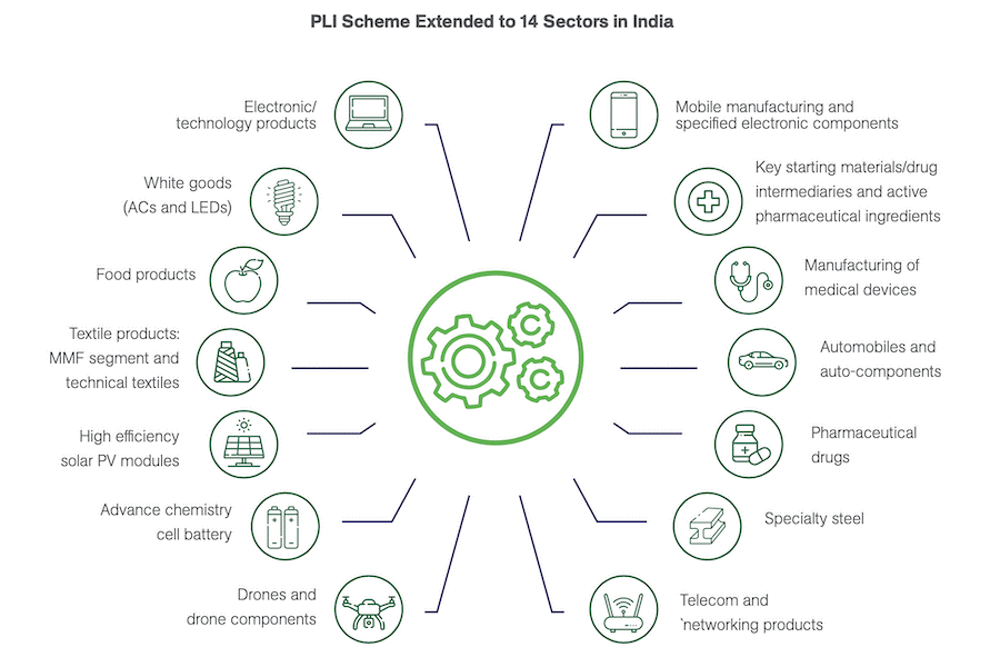 - To develop India into a global manufacturing hub and speed up job creation, the government has rolled out PLI schemesin 14 sectors since 2020, with incentives amounting to INR 1.97 trillion (US$23.81 billion).