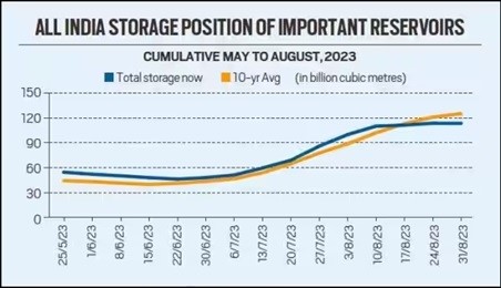- According to the most recent Central Water Commission (CWC) data, these 150 reservoirs around the country had roughly 113 billion cubic meters (BCM) of water, which was nearly 10% less than the normal--or average--storage at this time of year.