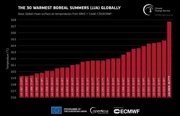 - With an average temperature of 16.77 degrees Celsius, which was 0.66 degrees Celsius higher than the 1990-2020 average, the three-month period from June to August smashed prior records.