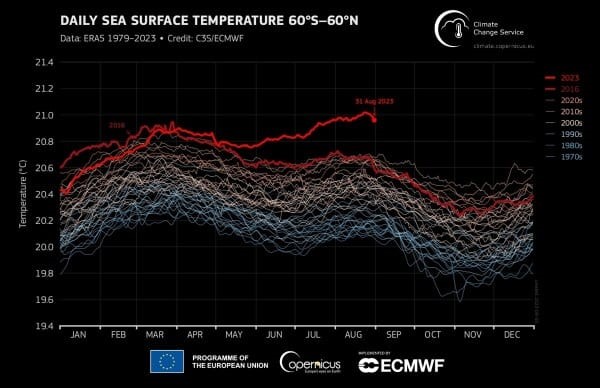- The global average sea surface temperature is likewise out of this world. Every day from July 31 to August 31, 2023, the worldwide average sea surface temperature was higher than the previous record from March 2016.