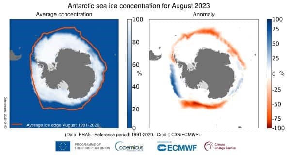 - According to C3S, the monthly value for sea ice cover was 12% below average in August, the highest negative anomaly for August on record.