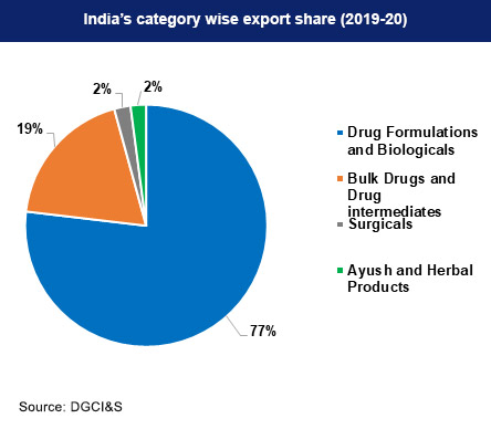- India majorly exports drug formulations & biologicals, and these products contribute to about 75% of the total pharmaceuticals exports out of India.
