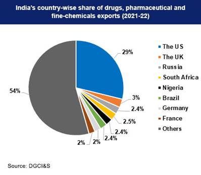 - USA, the UK and Russia are among the largest importers from India at a share of 29%, 3% and 2.4%, respectively during 2021-22. India’s exports of pharma products to these countries in FY21-22 were: USA with US$ 7,101.6 million, the UK with US$ 704.5 million, South Africa with US$ 612.3 million, Russia with US$ 597.8 million, and Nigeria with US$ 588.6 million. India’s pharma exports to USA in value grew at a CAGR of 6.9% over last three years. Additionally, for UK and Russia, it grew at a CAGR of 3.8%, and 7.2%, respectively over the same period.