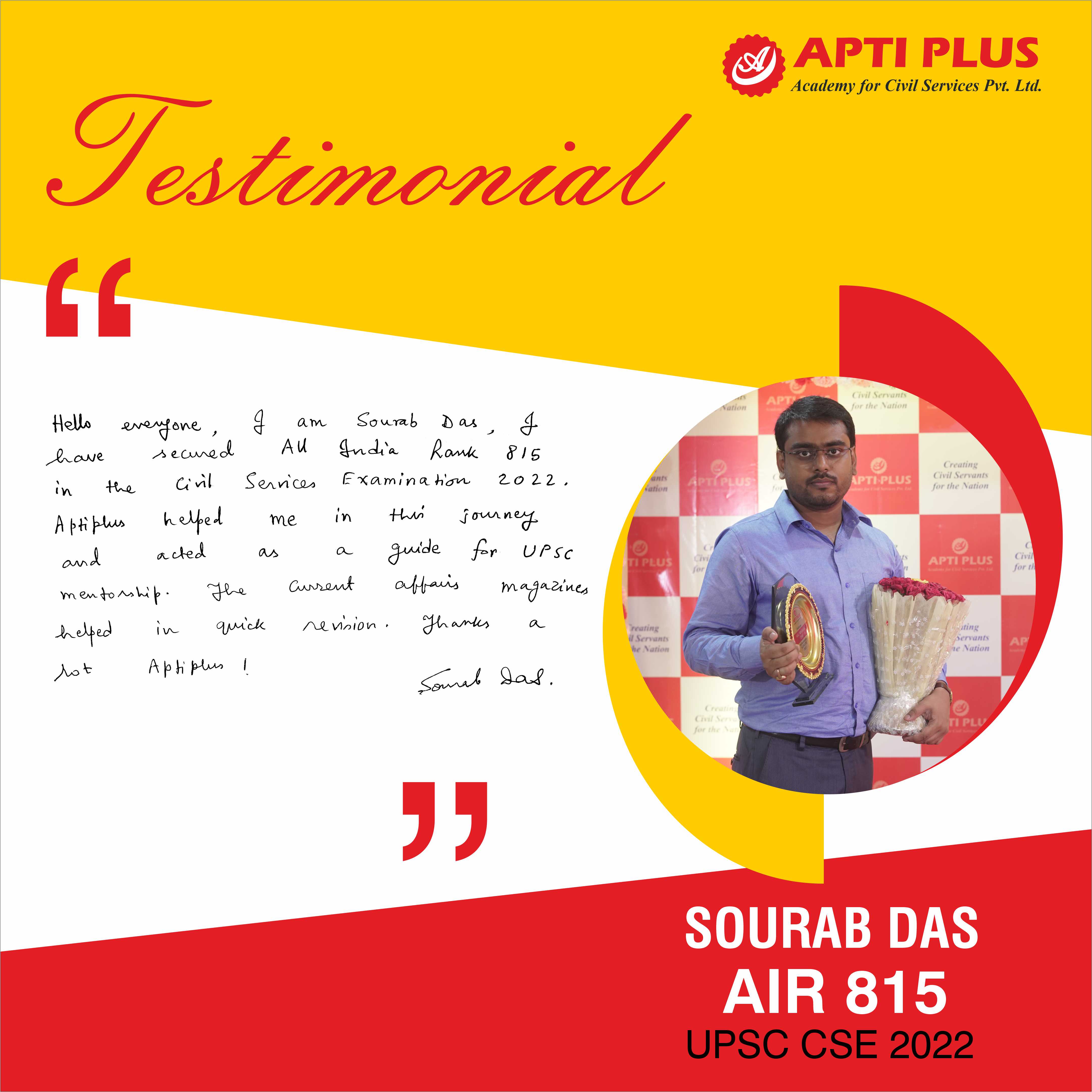 Hello everyone , I am Sourav Das, I have secured All India rank 815 in the Civil Service Examination 2022. Apti plus helped me in their journey and acted as a guide for UPSC mentorship.The current affairs magazines helped in quick revision. Thanks a lot Apti plus!