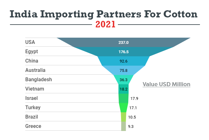 India's major Export destinations in 2018-19 were Bangladesh, China & Pakistan. Countries such as Bangladesh, China, Pakistan, Vietnam and Indonesia are scaling up their cotton imports from India to meet the requirements of their export-focused garment industries. China remains India's largest import partner even in 2021-22.