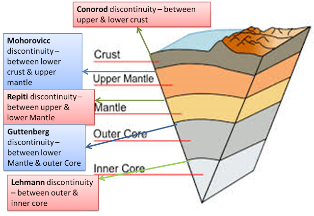 The structure of the earth is divided into four major components: the crust, the mantle, the outer core, and the inner core. Each layer has a unique chemical composition, physical state, and can impact life on Earth's surface. All these layers are separated from each other through a transition zone. These transition zones are called discontinuities.