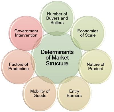 Some of the factors that determine a market structure include the number of buyers and sellers, ability to negotiate, degree of concentration, degree of differentiation of products, and the ease or difficulty of entering and exiting the market.