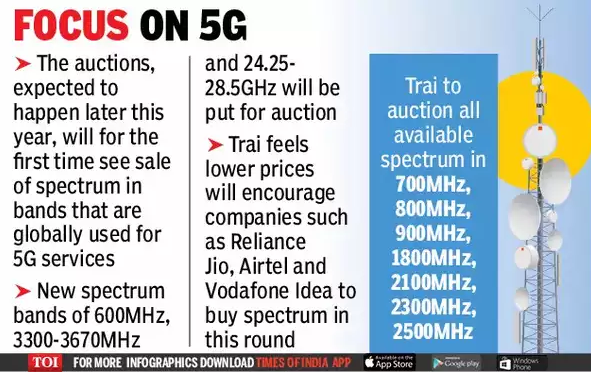 - For the auction of the 5G spectrum, the telecom regulatory body suggested that the base price for prime 5G band of 3300-3670 MHz be kept at Rs 317 crore per MHz, which is 35 per cent lower than the base price of Rs 492 crore per MHz announced in 2018.