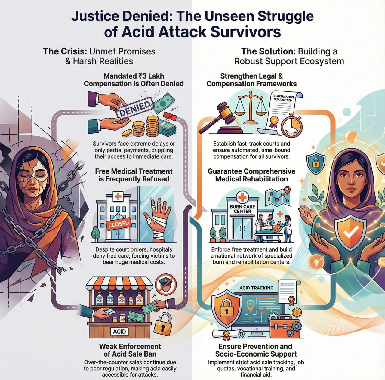 Acid attacks persist in India despite strong laws and Supreme Court directives. The failure lies in weak enforcement, unregulated acid sales, delayed compensation and poor rehabilitation. Addressing this crime demands strict implementation, speedy justice, survivor-centric rehabilitation and sustained efforts to challenge patriarchal attitudes.