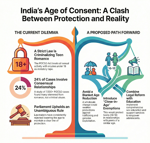 Reforming the POCSO Act requires a balanced approach to the age of consent. It must protect minors while allowing judicial discretion and exemptions for closely-aged adolescent relationships, supported by comprehensive educational programs.
