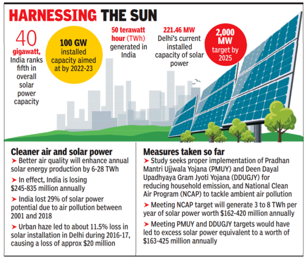 The study conducted by IIT Delhi & published in Environmental Research Letters (Nov 2024) examines how air pollution & climate change impact solar power generation in India.