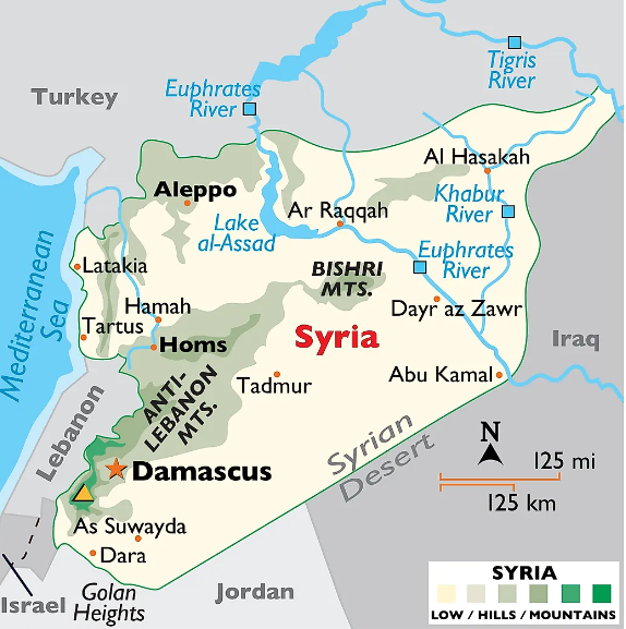 Syria is a West Asian country having Turkey, Iraq, Jordan, Lebanon, and Israel as its bordering countries. It also has a coastline with the Mediterranean Sea on its west.