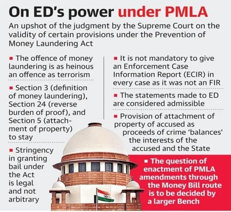 Context: The anti-money laundering law expanded over time, granting the Enforcement Directorate police powers, upheld by the Supreme Court, with stringent bail conditions and broadened offences.