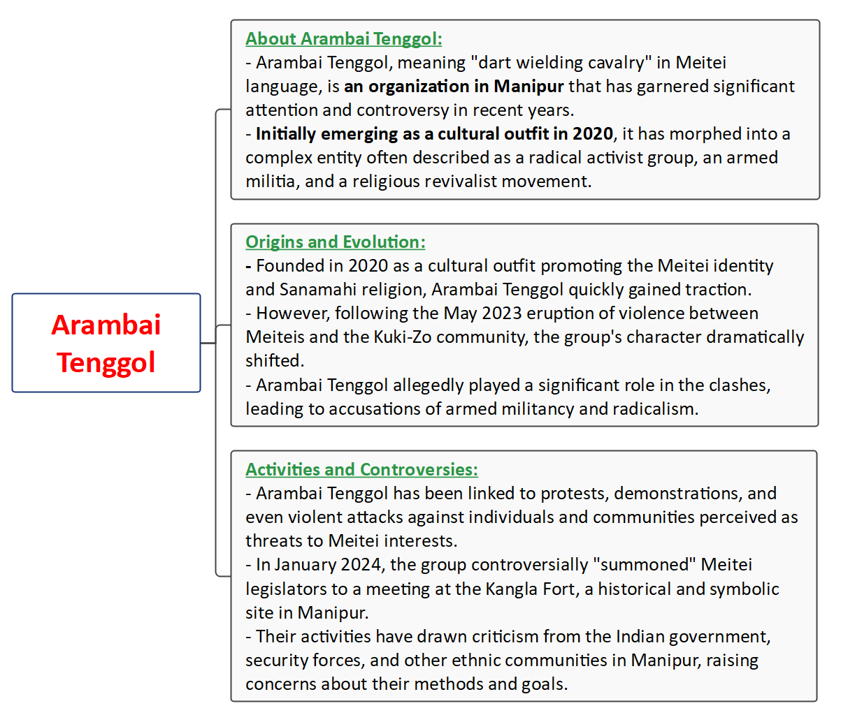 - Arambai Tenggol, initially established as a socio-cultural outfit in 2020, has gained significant public support and administrative influence in the Imphal Valley over the past nine months. The group, named after ancient Meitei warriors, boasts estimated armed cadre strength of around 2,000 and support from several thousand volunteers.