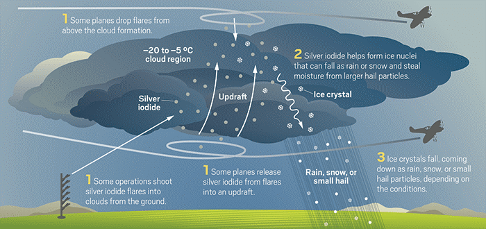 Cloud Seeding is a scientific process involving dispersal of substances (typically silver iodide, potassium iodide or sodium chloride) into clouds.