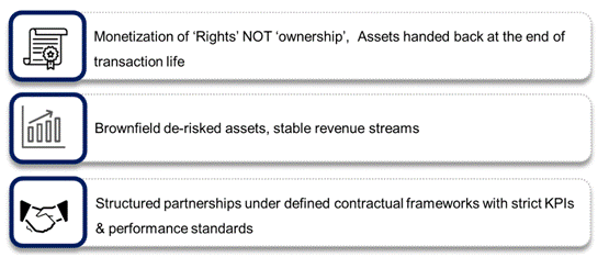 Asset Monetisation needs to be viewed not just as a funding mechanism, but as an overall paradigm shift in infrastructure operations, augmentation and maintenance considering private sector’s resource efficiencies and its ability to dynamically adapt to the evolving global and economic reality.