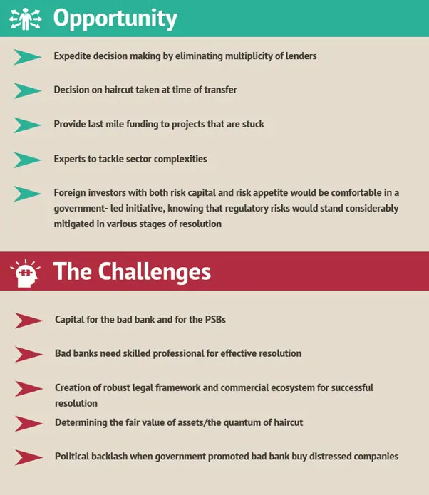- Critics of the bad bank concept, however, contend that the government’s role in guaranteeing some part of the NPAs could lead to laxity on the part of bankers in assessing risk and thus creating fresh loans.