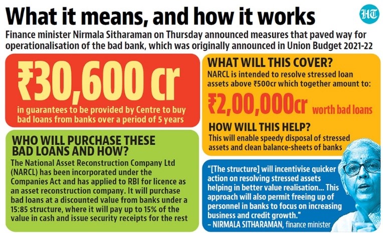 If the bad bank is unable to sell the bad loan, or has to sell it at a loss, then the government guarantee will be invoked and the difference between what the commercial bank was supposed to get and what the bad bank was able to raise will be paid from the Rs 30,600 crore that has been provided by the government.