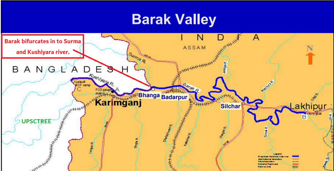 North: Barail range (separates from Brahmaputra sub-basin), East: Naga and Lushai hills, South & West: Bangladesh. |