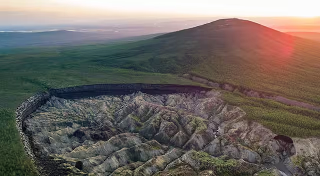 Context: The "gateway to the underworld" in Siberia (Russia) officially known as Batagay (or Batagaika), is an enormous crater that has been rapidly growing due to the effects of permafrost thaw.