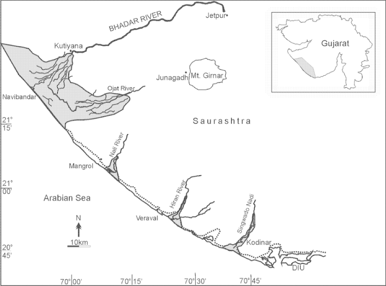 It is a river in the Saurashtra peninsula, in the Western Indian state of Gujarat. It flows south from its origin through Jasdan, then turns south-west and generally west until it empties into the Arabian Sea near Porbandar.