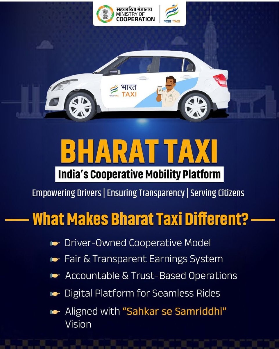 Bharat Taxi is a government-backed cooperative ride-hailing platform operated by Sahakar Taxi Cooperative Ltd (STCL), designed to provide a zero-commission, driver-owned alternative to private aggregators. The platform allows bookings for cars, auto-rickshaws, and two-wheelers, while enabling drivers to become co-owners through share participation and benefit from future profits. It focuses on fair, transparent pricing and aims to improve driver earnings and welfare within the gig economy. Currently operational in select cities with around 4 lakh drivers onboarded and about 10,000 daily rides, the initiative faces early challenges such as low demand and operational issues, but targets nationwide expansion by 2029, positioning itself as a potential large-scale cooperative model in India’s digital platform economy.