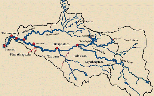 Flows west through the Palakkad Gap (Palghat Gap), through the Palakkad and Malappuram districts of Kerala, with many tributaries joining it. |