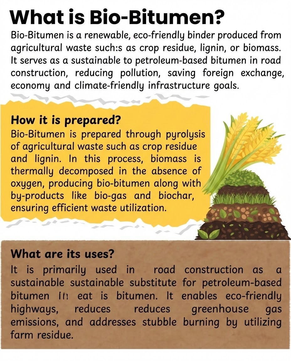 India’s breakthrough in commercial bio-bitumen production turns agricultural waste into sustainable roads using CSIR technology. This "Waste-to-Wealth" model slashes costly petroleum imports, curbs winter stubble burning pollution, and boosts rural incomes, marking a carbon-negative leap toward Viksit Bharat 2047.