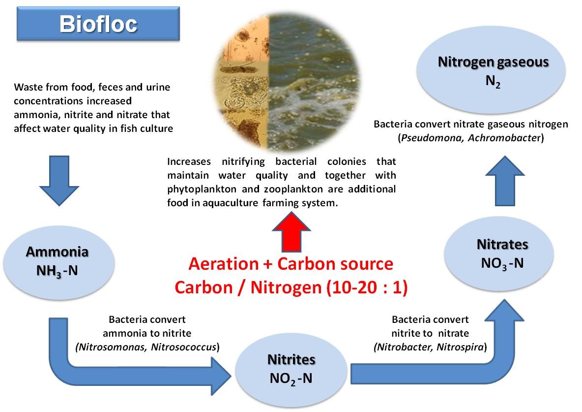 - The principle of this technique is the generation of nitrogen cycle by maintaining higher C: N ratio through stimulating heterotrophic microbial growth, which assimilates the nitrogenous waste that can be exploited by the cultured spices as a feed.