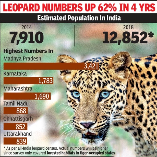 - Status of leopards in India, 2018, mentions that the country has 12,852 leopards.