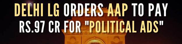 - Delhi Lieutenant-Governor (L-G) has directed the Chief Secretary of Delhi to recover ₹97.14 crores plus interest from the Delhi Government for “political advertisements” published or telecast as government advertisements in 2015 and 2016.