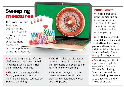 Gambling-related online money games (RMG) are banned. Offering, promoting, or financing these games is criminalized, with penalties up to two years in prison and ₹50 lakh fines for advertising.