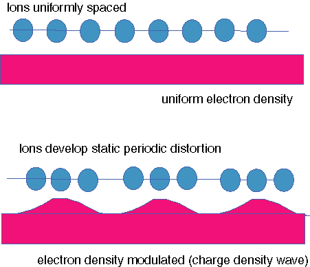 Charge Density Waves Charge density wave (CDW) is an intriguing physical phenomenon especially found in two-dimensional (2D) layered systems. A charge density wave (CDW) is an ordered quantum fluid of electrons in a linear chain compound or layered crystal. The electrons within a CDW form a standing wave pattern and sometimes collectively carry an electric current. Charge Density Waves form due to the wave-like nature of electrons – a manifestation of quantum mechanical wave-particle duality – causing the electronic charge density to become spatially modulated, i.e., to form periodic "bumps" in charge. CDW is vital for understanding lattice modification, strongly correlated electronic behaviors, and other related physical properties.