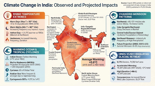 India's average landmass warmed by 0.9°C in the last decade (2015-2024), but this warming is uneven. The main threat is the intensification of extreme heat and regional variations.