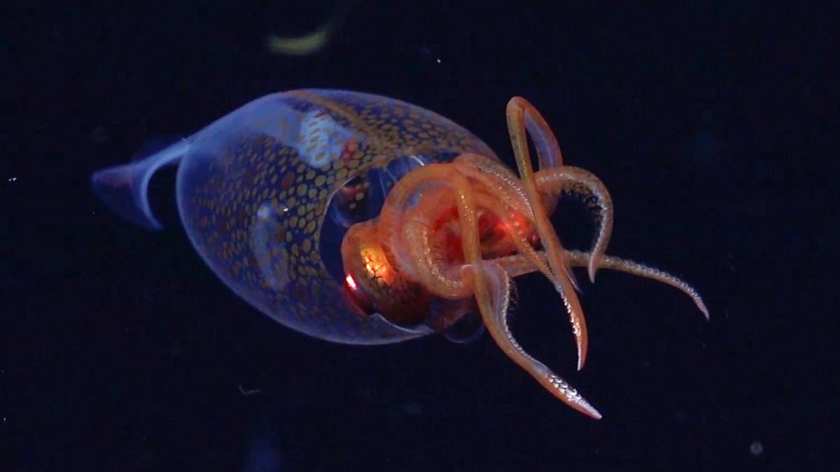 Young squids are nearly transparent giving a glassy, ghost-like appearance.