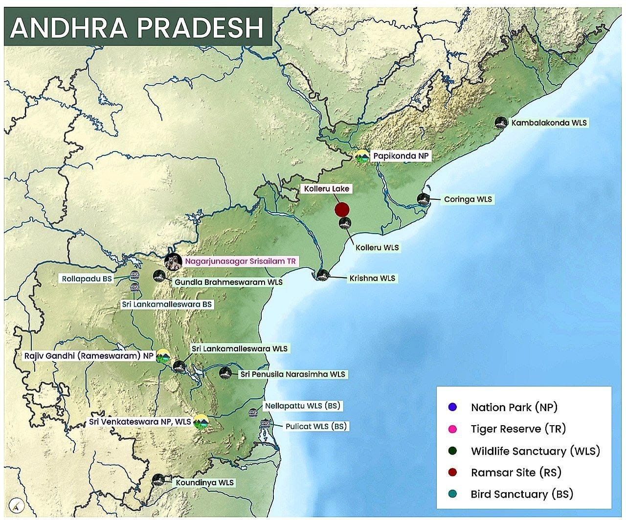 Which of the statements given above is/are correct? (a) 1 only (b) 2 only (c) Both 1 and 2 (d) Neither 1 nor 2 Answer: b Explanation: Statement 1 is incorrect: Coringa Wildlife Sanctuary is located where the Koringa River meets the Bay of Bengal, not the Arabian Sea, and it has broad mangroves and dry deciduous tropical forests, not dry thorn forests. Statement 2 is correct: The Fishing Cat is indeed protected under Schedule I of the Wildlife Protection Act, 1972, and it thrives in wetlands, including mangrove forests and tidal creeks. |