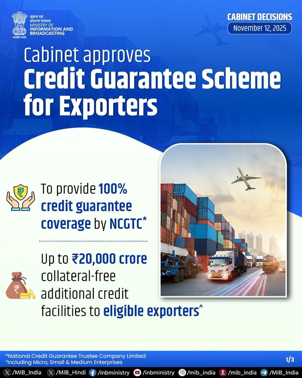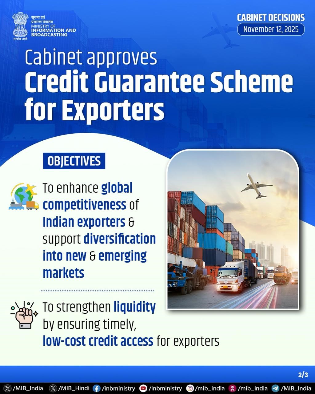 The Credit Guarantee Scheme for Exporters (CGSE) has been approved by the Union Cabinet to provide collateral-free credit support of up to ₹20,000 crore to eligible exporters, including MSMEs. The scheme will offer 100% credit guarantee coverage through the National Credit Guarantee Trustee Company Limited (NCGTC).