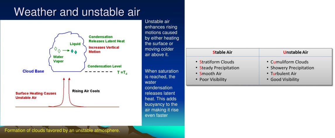 · If an air parcel is warmer than its surrounding environment, then it will be less dense than its surroundings and will rise like a hot air balloon. This is Unstable Air and has the potential for creating thunder storms if it contains enough water vapor.
