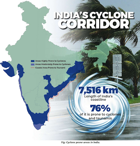 India Meteorological Department (IMD): Nodal agency for issuing cyclone early warnings. It monitors tropical cyclones in the Bay of Bengal and the Arabian Sea and provides forecasts and location-specific bulletins to coastal states.