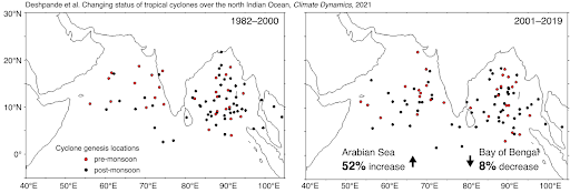 Increased Frequency: A 52% increase was noticed in the frequency of cyclones over the Arabian Sea between 2001 and 2019, and an 8% decrease over the Bay of Bengal. |